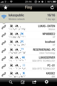 Früher gab es im Lukas eine Telekom Hotspot. Dieser scheint wohl außer Betrieb zu sein. Stattdessen gibt es ein Wi-Fi Namens lukaspublic, welches für alle offen ist. Damit kommen wir auch schon zu meiner nächste App-Empfehlung: Fing, ein kleiner Netzwerkscanner für das iPhone und iPad, der einfach das Subnetz nach Geräten scannt und ein paar Informationen dazu anzeigt. Man konnte gleich sehen, dass deren Kassensysteme, HP Drucker und Fileserver im selben Netzwerksegment hängen. So etwas sollte man nicht machen. Das lädt doch Leute dazu ein etwas Schabernack zu treiben.