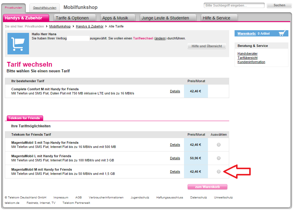 Den gewünschten Tarif wählen und in den Warenkorb damit.